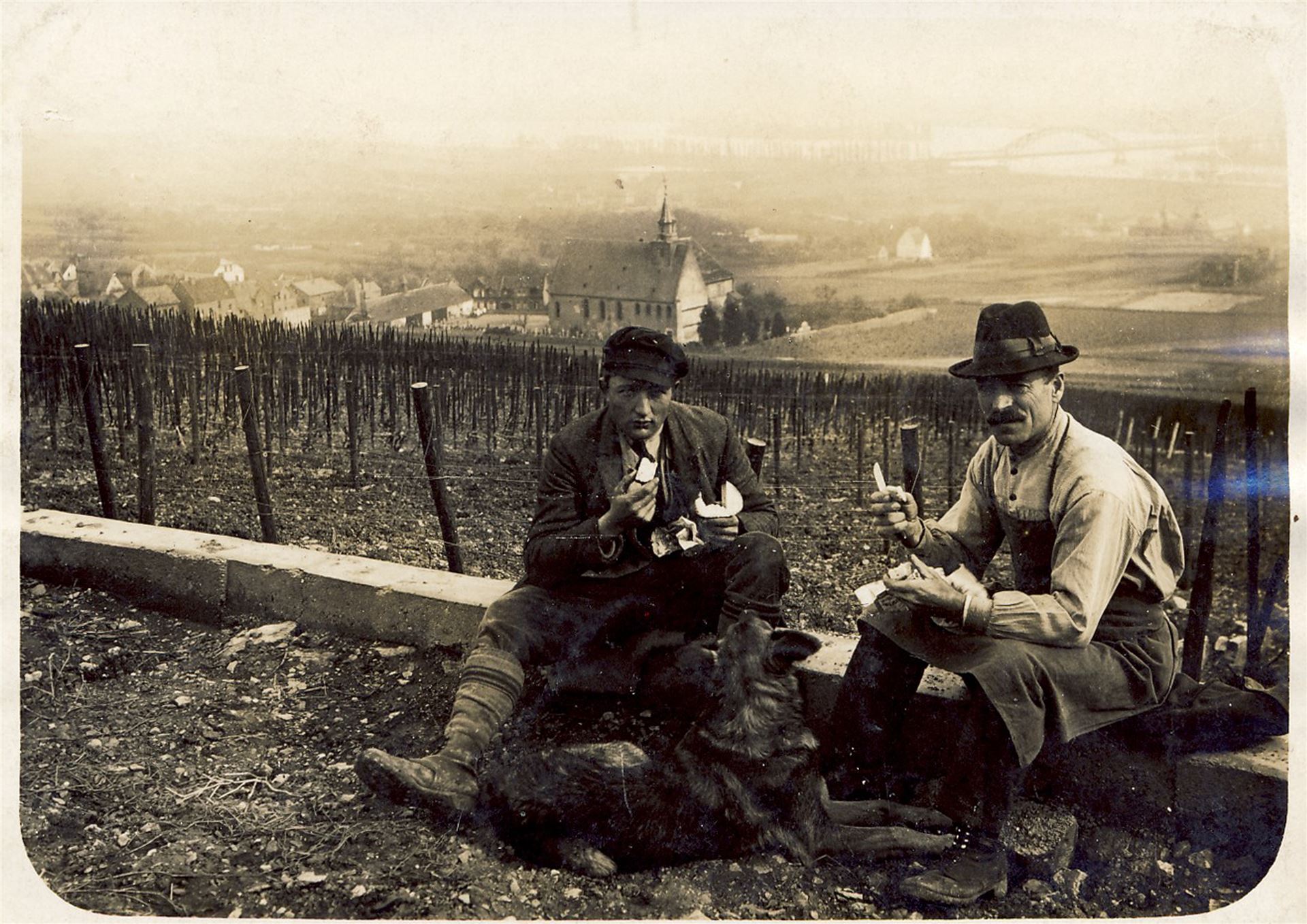 das Bild (v.l.n.r) zeigt Josef Krancher mit Vater Leonard bei einer Brotzeit zwischen den Weinbergsarbeiten